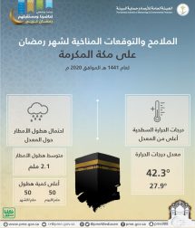 وأفاد التقرير أنه من خلال تحليل البيانات المناخية لمكة المكرمة التي اتصف الطقس عليها خلال تلك الفترة بأنه حار خلال النهار بحيث يصل معدل درجات الحرارة العظمى إلى 42,3˚˚م ، ويميل نسبياً للاعتدال ليلاً حيث يصل معدل درجة الحرارة الصغرى إلى 27,9 ˚م , كما تتواجد تشكيلات من السحب المنخفضة والمتوسطة الارتفاع، فيتوقع خلال شهر رمضان هذا العام على مكة المكرمة أن يكون هطول الأمطار حول المعدل (المعدل 2,1مم/بالشهر)، فيما يتوقع ارتفاع درجات الحرارة السطحية بمعدلات في حدود (+0 ، 1) مئوية.