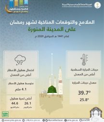 كما أوضح التقرير أنه من خلال دراسة الفترة المناخية التاريخية للمدينة المنورة خلال شهر رمضان (مايو) يمكن وصف الطقس بأنه حار خلال النهار حيث يصل معدل درجات الحرارة العظمى إلى 39,7˚˚م ، ويميل نسبياً للإعتدال ليلاً حيث يصل معدل درجة الحرارة الصغرى الى 25,8 ˚م. كما تتواجد تشكيلات من السحب المنخفضة والمتوسطة الإرتفاع .