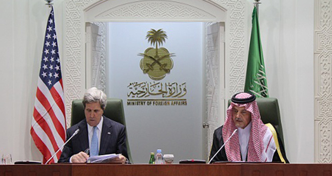 وقال الفيصل، خلال مؤتمر صحفي مشترك مع وزير خارجية الولايات المتحدة الأمريكية جون كيري، عقب الاجتماع الإقليمي لمكافحة الإرهاب في المنطقة، بحضور وزراء خارجية كل من دول مجلس التعاون لدول الخليج العربية، ومصر، والعراق، والأردن، ولبنان، وتركيا، وبحضور الولايات المتحدة الأمريكية: “غني عن القول أن أي تحرك أمني ضد الإرهاب لكي يؤتي نتائجه المطلوبة لا بد أن يصاحبه تحرك جاد نحو محاربة الفكر الضال المؤدي إليه، وقطع التمويل عن الإرهابيين، سواء بالمال أو السلاح، بما في ذلك مراقبة السلاح المتدفق من بعض الدول التي لا هم لها سوى زعزعة أمن واستقرار المنطقة والتدخل السافر في شؤونها وبعثرة أوراقها”.