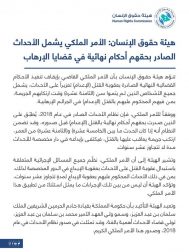 نوهت هيئة حقوق الإنسان بأن الأمر الملكي القاضي بإيقاف تنفيذ الأحكام النهائية الصادرة بعقوبة الـقتل (الإعدام) تعزيراً على الأحداث، يشمل جميع مَن لم يتموا سن الـ 18 وقت ارتكابهم الجريمة، بمن فيهم المحكوم عليهم بالإعدام في الجرائم الإرهـابية.