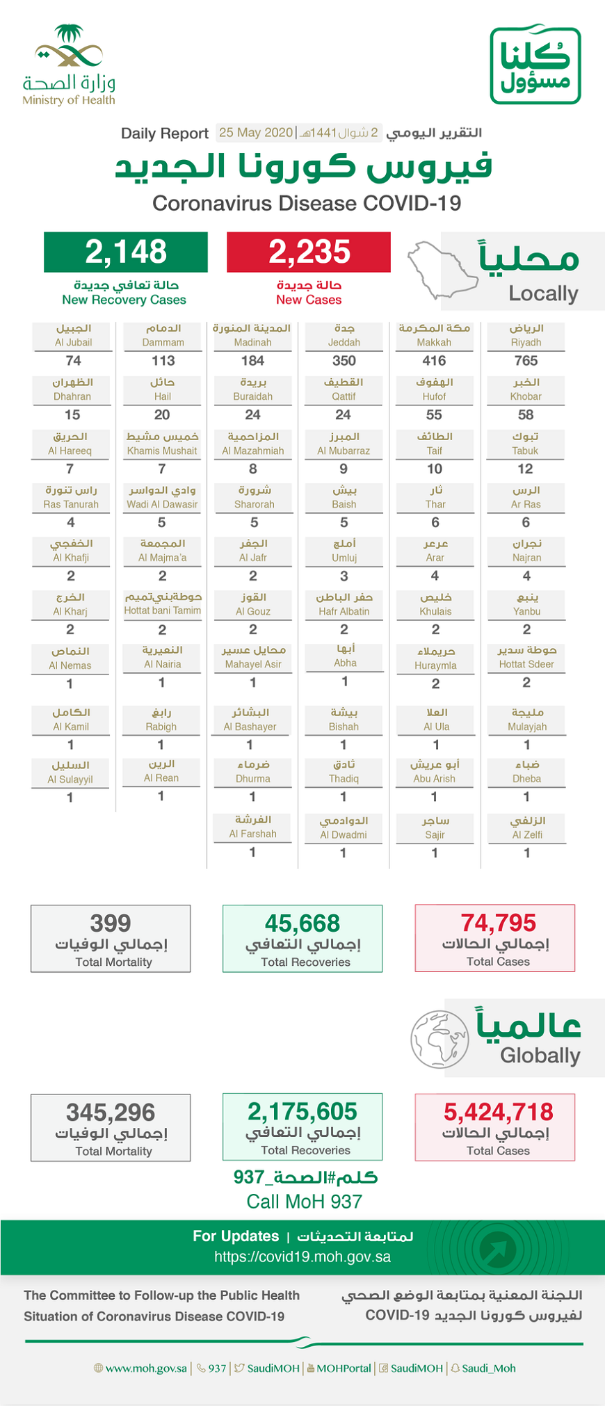 وقال المتحدث لوزارة الصحة الدكتور محمد العبدالعالي، خلال مؤتمر صحفي الاثنين «25 مايو 2020م»، إن عدد المتعافين الجدد بالفيروس بلغ 2148 حالة، وبلغ إجمالي حالات التعافي 45668 حالة.