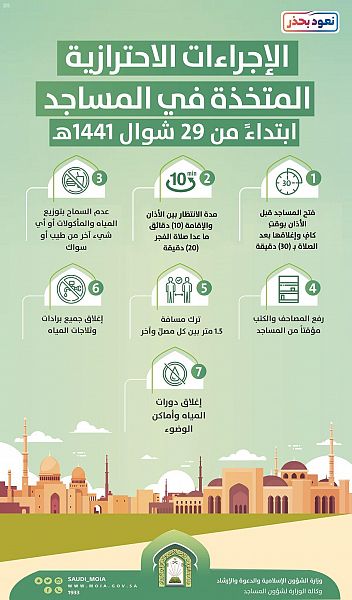 وتضمنت الإجرءات فتح المساجد قبل الأذان بـوقت كافِ وإغلاقها بعد الصلاة بــ 30 دقيقة ،مع الإبقاء على تقليل مدة الانتظار بين الأذان والإقامة إلى عشر دقائق عدا صلاة الفجر بـ 20 دقيقة، ورفع المصاحف والكتب مؤقتاً، وإلزام المصلين على ترك مسافة متر ونصف بين كل مصلي وآخر من جميع الجهات، والتأكيد على إغلاق جميع برادات وثلاجات المياه، وعدم السماح بتوزيع المياه أو المأكولات في المسجد أو أي شيء آخر من طيب وسواك، وإغلاق دورات المياه وأماكن الوضوء .