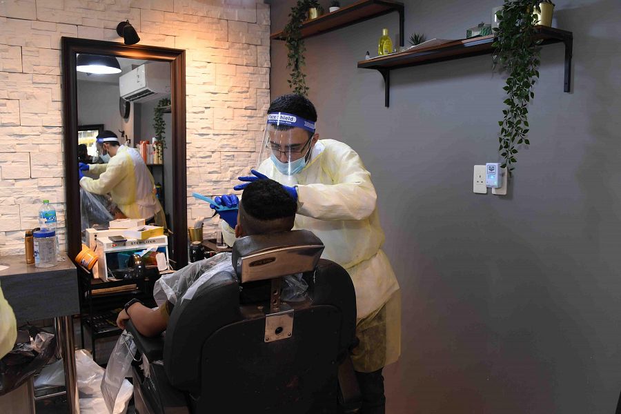 وشهدت صوالين الحلاقة الرجالية في مختلف المدن والقرى بالمنطقة إقبالاً طفيفاً يسوده الحذر، وسط تطبيق الإجراءات والبروتوكولات الوقائية بداخلها ضماناً لسلامتهم، واحترازاً من انتقال فيروس عدوى كورونا.