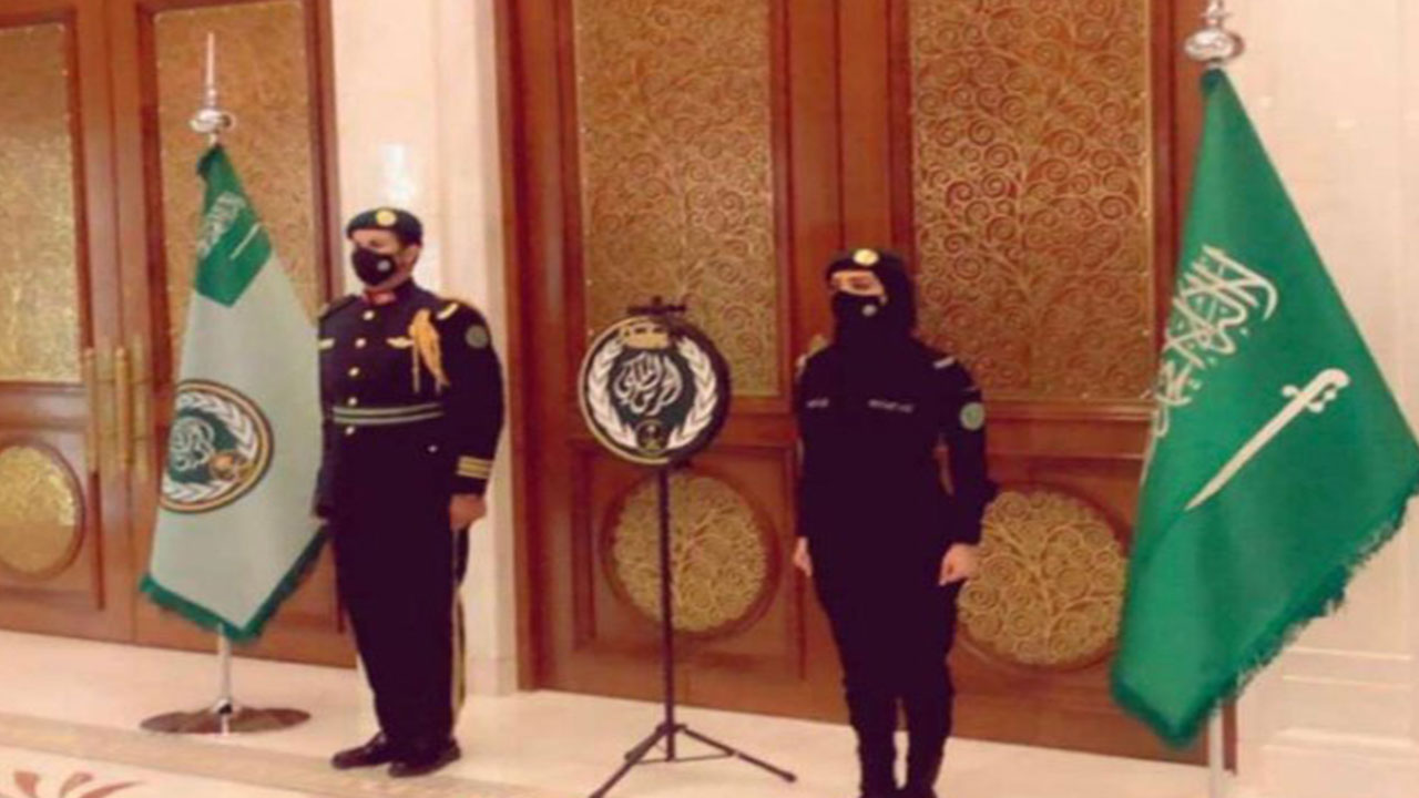 ويظهر في الصورة المتداولة عبر منصات التواصل الاجتماعي، امرأة ترتدي الزي الرسمي للحرس الملكي السعودي، وتقف بجانب زميل لها، وقد ارتديا كمامات واقية.