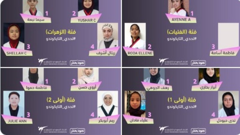 فئة أولى 1: 1.رهف الجوهي (لاعبة المنتخب السعودي للتايكوندو)، 2. أبرار بخاري (لاعبة المنتخب السعودي للتايكوندو)، 3.علياء فادان، 4.ندى حبودل.