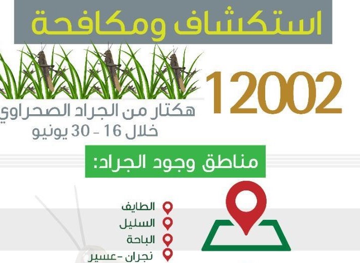 وأوضحت الوزارة أنه تم استكشاف 12002 هكتار خلال النصف الثاني من يونيو الماضي، بينما تمت معالجة 1585 هكتار في كلٍّ من محافظة الطائف، ومناطق الرياض والباحة ونجران. مؤكدة أن وضع الجراد الصحراوي في تلك المناطق تحسن ولله الحمد، وأن عمليات الاستكشاف والمكافحة مستمرة حتى إعلان التطهير وانقضاء الإصابة تماماً.