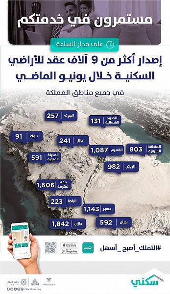 “سكني”: إصدار أكثر من 9 آلاف عقد للأراضي السكنية خلال يونيو الماضي