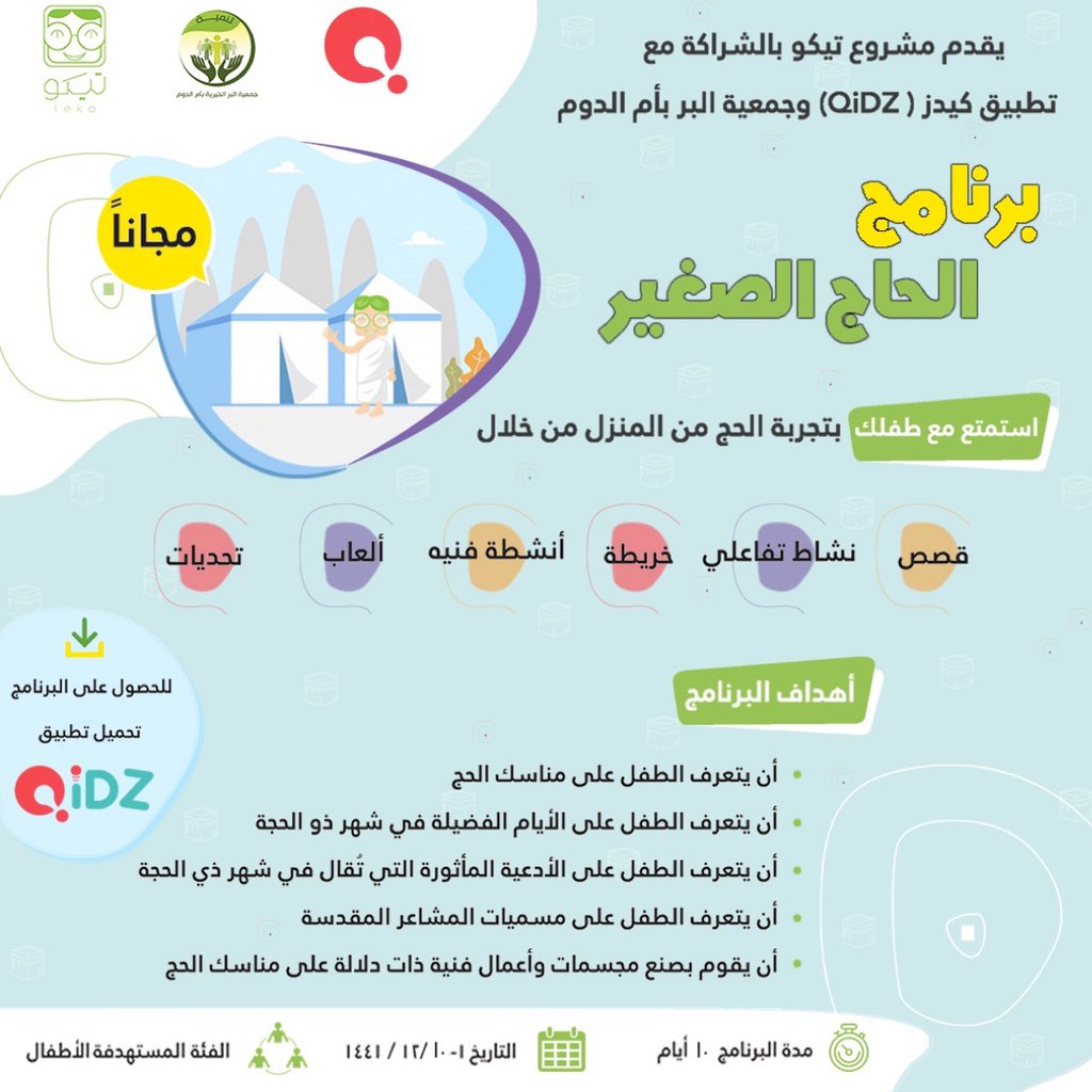 بما أن الأطفال هم مستقبل كل مجتمع، ولابد من تعليمهم وتثقفيهم، عقد مشروع تيكو شراكة مجتمعية مع Qidz (تطبيق تفاعلي للأنشطة و الفعاليات العائلية)، وجمعية البر بأم الدوم، لتقديم برنامج تحت مسمى (الحاج الصغير)، ابتدأ في أول أيام الشهر الجاري وحتى اليوم العاشر من ذي الحجة، حيث قدمت الجمعية مبالغ مادية للفائزين، وعددهم 25 فائز.