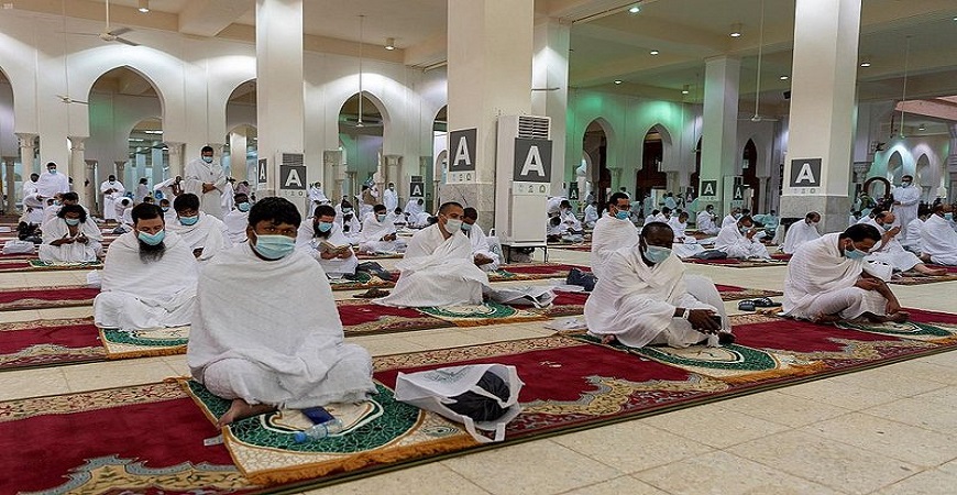 وأخذ ضيوف الرحمن أماكنهم مع الالتزام بالتباعد المكاني في المسجد الذي تبلغ مساحته (110) آلاف متر مربع .