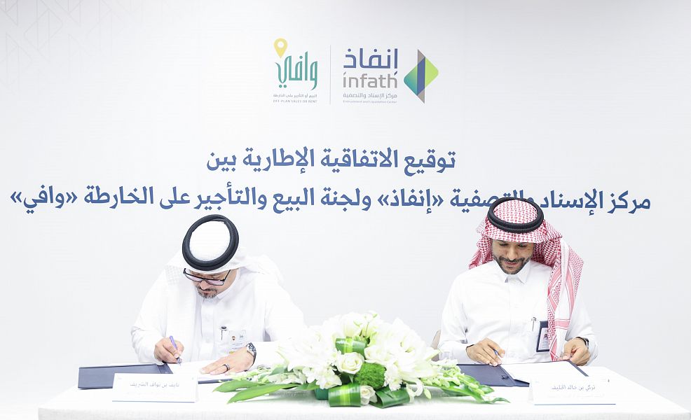 عقد مركز الإسناد والتصفية “إنفاذ” ولجنة البيع على الخارطة “وافي” اتفاقية تعاون مشترك تتيح للّجنة الاستعانة بـإنفاذ لمعالجة المشاريع العقارية المرخصة للبيع على الخارطة في حال تعثرها من خلال إسنادها إلى المركز ليشرف على تصفيتها؛ بهدف ضمان وحفظ حقوق جميع الأطراف المتعاقدة في المشروع من المشترين والشركات والجهات التمويلية، وقد مثّل المركز الرئيس التنفيذي تركي الخليف، كما مثّل اللجنة في التوقيع الأمين العام نايف الشريف.
