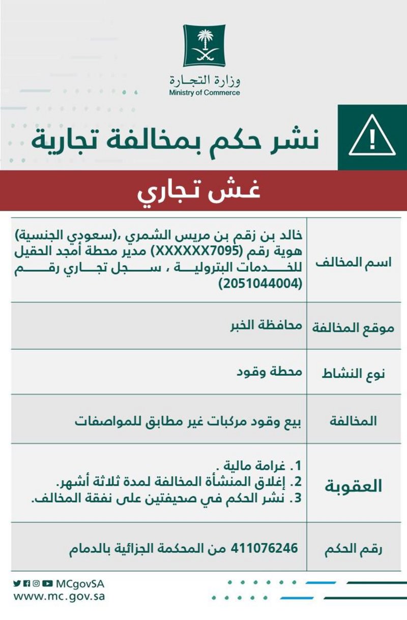 شهّرت وزارة التجارة بمدير محطة محروقات بمحافظة الخبر بعد صدور حكم قضائي بإدانته بمخالفة نظام مكافحة الغش التجاري وثبوت تورط المنشأة في الغش عبر بيع وقود غير مطابق للمواصفات والمقاييس.