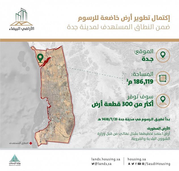 أعلن برنامج “الأراضي البيضاء” التابع لوزارة الإسكان عن اكتمال تطوير أرض خاضعة للرسوم من قِبل مالكها في محافظة جدة بمساحة تتجاوز 186 ألف متر مربع.