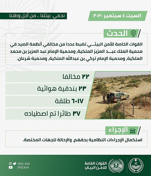ضبطت القوات الخاصة للأمن البيئي أثناء أدائها لمهامها في محميات الملك عبدالعزيز الملكية، والإمام عبدالعزيز بن محمد الملكية، والإمام تركي بن عبدالله الملكية، ومحمية شرعان، (22) شخصاً من مخالفي أنظمة الصيد، وبحوزتهم (23) بندقية هوائية، و(6017) طلقة، وعدد من الأدوات التي تستخدم في الصيد، إضافة إلى (37) طائراً تم اصطيادها.