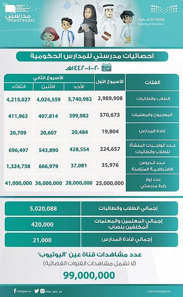 كشفت وزارة التعليم أمس عن إحصاءات منصة مدرستي للتعليم عن بُعد في المدارس الحكومية، ‏حيث أظهرت تلك الأرقام عن قصة نجاح جديدة للوزارة بدعم وشراكة من الأسر وأولياء الأمور، وتفاعل المعلمين والمعلمات وقادة المدارس، بما يضمن استمرار الرحلة التعليمية للطلاب والطالبات في عام دراسي استثنائي في ظل جائحة كورونا.