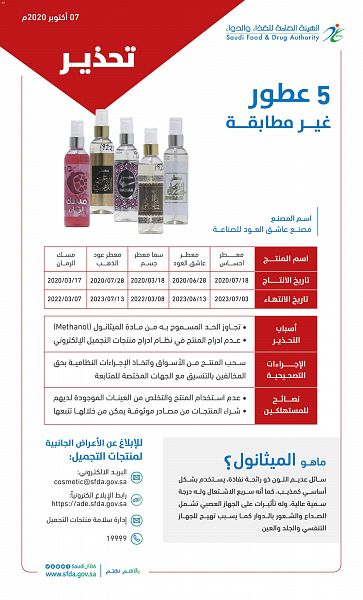 حذّرت الهيئة العامة للغذاء والدواء من خمس عطور بسبب احتوائها على نسبة عالية من مادة الميثانول (Methanol) تجاوزت الحد المسموح به في لائحة متطلبات السلامة في مستحضرات التجميل والعناية الشخصية رقم SFDA.CO/GSO1943:2016، مشيرة إلى أن التعرض لنسب عالية من مادة الميثانول (Methanol) قد يتسبب في مخاطر صحية للمستهلك، إذ يُعد من المواد ذات السمية العالية، كما أن له تأثيرات على الجهاز العصبي تشمل الصداع والشعور بالدوار، فضلًا عن تسببه بتهيج الجهاز التنفسي والجلد والعينين.