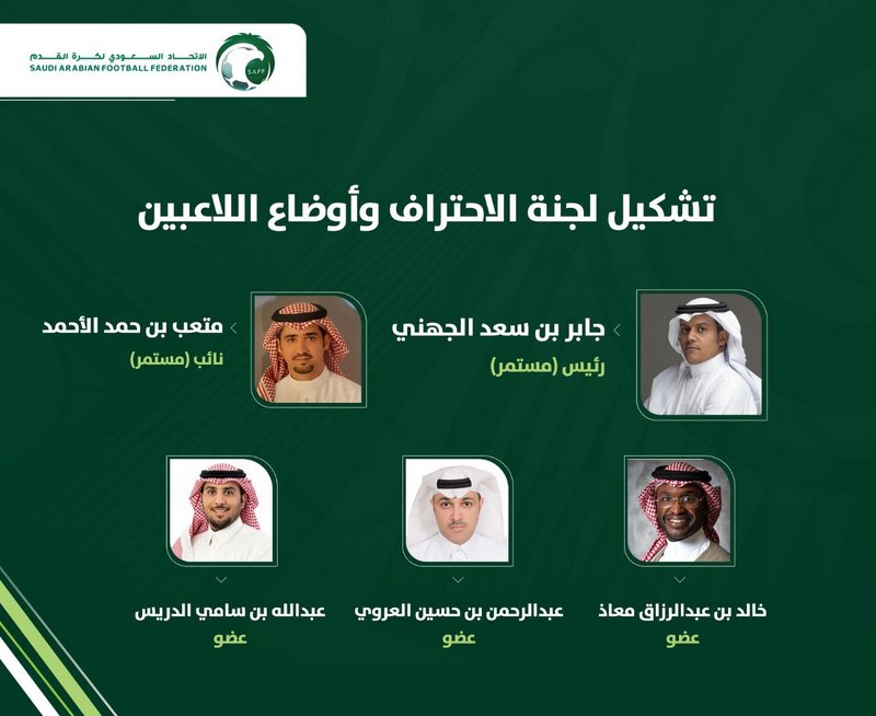 اعتمد مجلس إدارة الاتحاد السعودي لكرة القدم إعادة تشكيل لجنة الاحتراف وأوضاع اللاعبين برئاسة جابر بن سعد الجهني، ومتعب بن حمد الأحمد نائباً له.