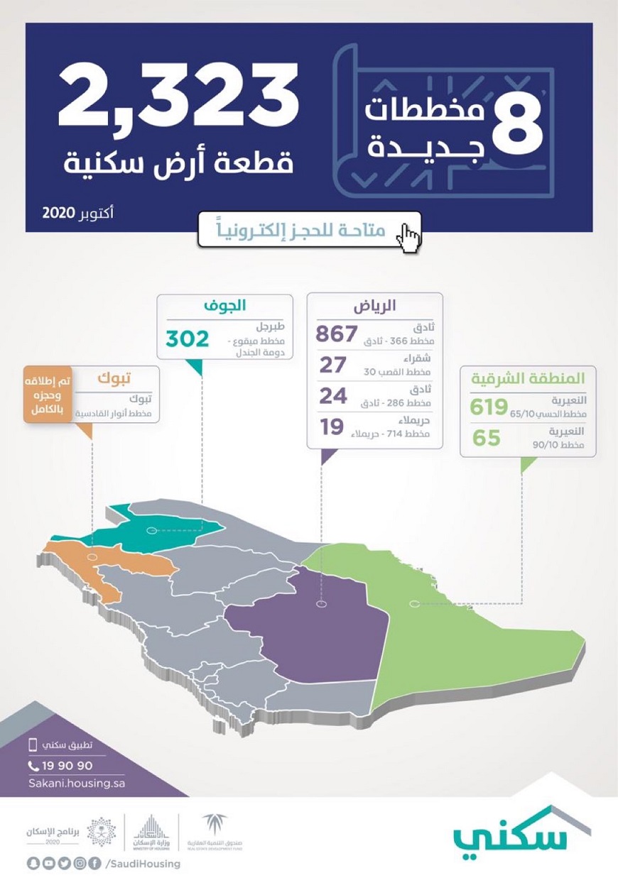 وقال برنامج «سكني» في بيانٍ صحافي، الثلاثاء «27 أكتوبر 2020»، إنه فعَّل الاختيار الإلكتروني لـ 8 مخططات جديدة مُوزعة على 4 مناطق توفر 2323 قطعة أرض، إذ أضاف “سكني” 4 مخططات في منطقة الرياض منها مخططين في محافظة ثادق هما مخطط “ثادق 366″ الذي يوفّر 867 أرض، و”ثادق 286” ويضّم 24 قطعة، ومخطط “القصب” بمحافظة شقراء ويحوي 27 قطعة، ومخطط “حريملاء 714” الذي يوفّر 19 أرض، جميعها متاحة للحجز إلكتروني.