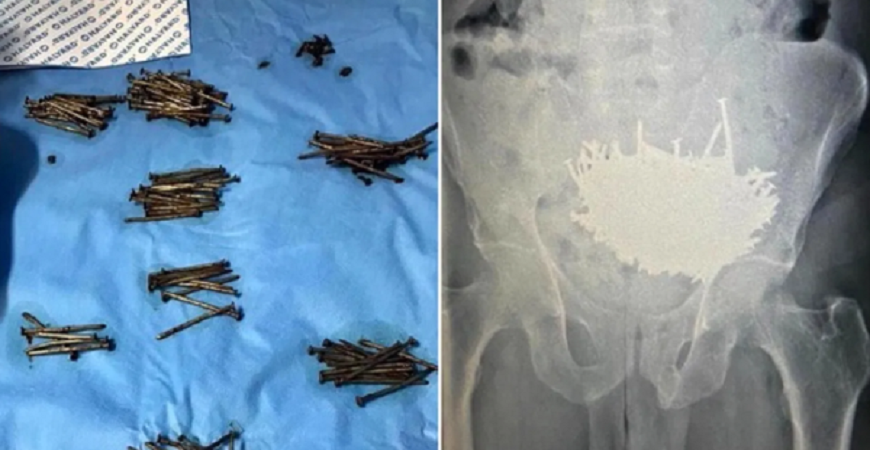 وتمكن الفريق الطبي من استخراج عدد 230 مسمارا وقطعا من الزجاج من بطنه، حيث كان يعاني من آلام وانتفاخ في البطن وقد أظهرت الفحوصات الإكلينيكية والإشعاعية وجود عدد كبير من المسامير (داخل معدة المريض) وهو ما استدعى إجراء عملية جراحية طارئة لاستخراج تلك المسامير وقطع الزجاج تحت تخدير عام عن طريق شق جراحي.