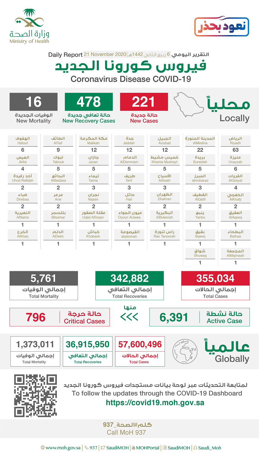 وقالت إنه تم تسجيل 478 حالة تعاف جديدة ليصبح الإجمالي 342882 حالة ولله الحمد.