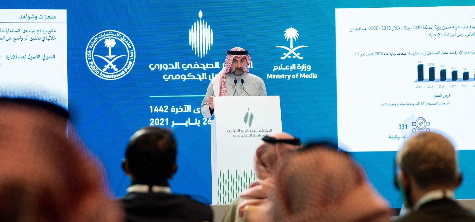 وقال خلال المؤتمر الصحفي الدوري للتواصل الحكومي الذي يأتي امتدادًا لتوجيهات ولي العهد الأمير محمد بن سلمان، إنه تم تخصيص محفظتين للاستثمارات الأجنبية للصندوق وأربع محافظ للاستثمار المحلي ضمن الاستراتيجية الجديدة للصندوق والتركيز على الاستثمارات المحلية ضمن الاستراتيجية الجديدة للصندوق، مضيفا أنه سيتم استثمار تريليون ريال في مشاريع جديدة خلال الـ5 سنوات المقبلة.