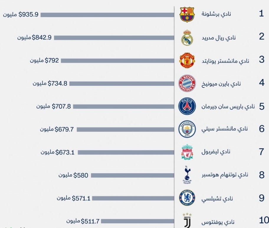 إليكم ترتيب نوادي كرة القدم بحسب إيرادات عام 2020: