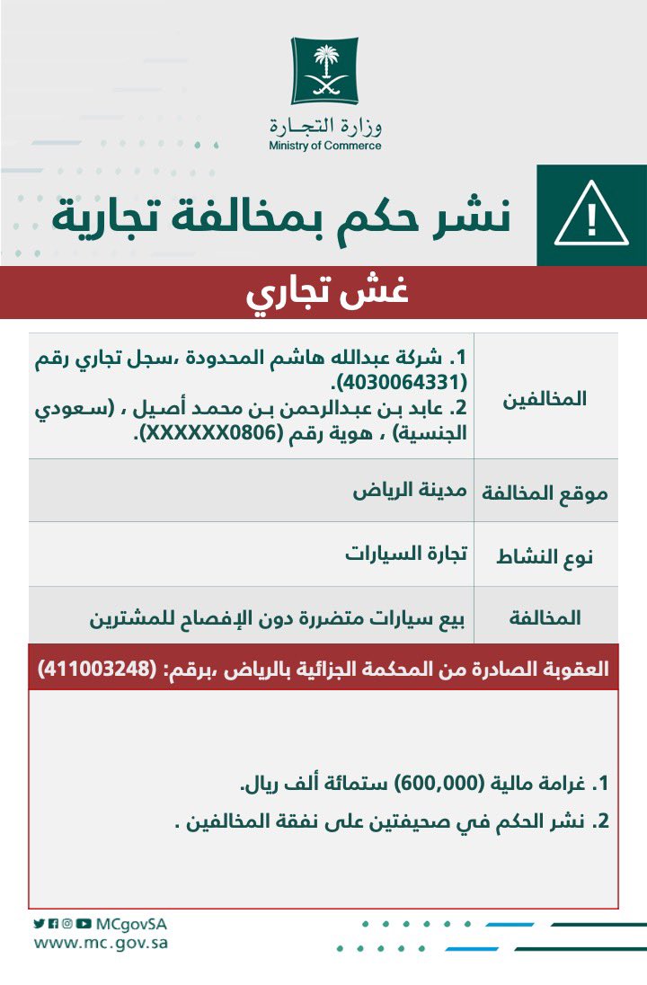 ونشرت الوزارة ملخص الحكم القضائي الصادر عن المحكمة الجزائية بالرياض المتضمن فرض غرامة مالية مقدارها 600 ألف ريال ونشر حكم المخالفة في صحيفتين على نفقة المخالفين.