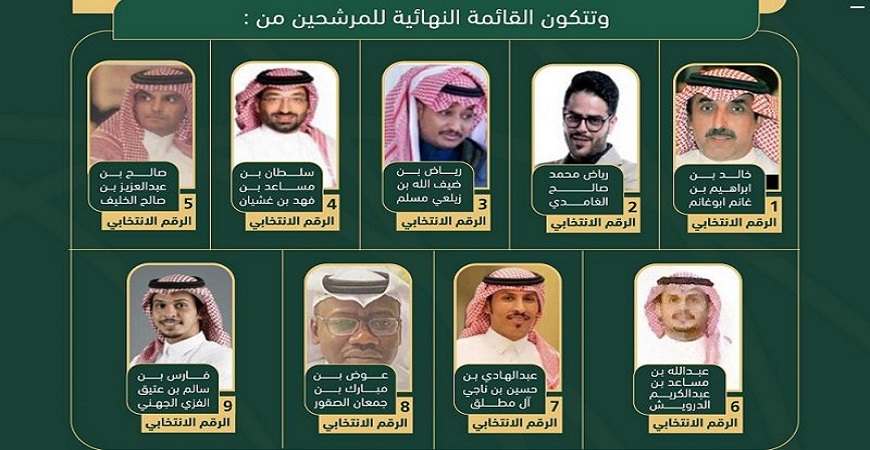 وشملت القائمة النهائية 9 مترشحين هم: خالد بن إبراهيم بن غانم أبوغانم، رياض محمد صالح الغامدي، رياض بن ضيف الله بن زيلعي مسلم، سلطان بن مساعد بن فهد بن غشيان، صالح بن عبدالعزيز بن صالح الخليف، عبدالله بن مساعد بن عبدالكريم الدرويش، عبدالهادي بن حسين بن ناجي آل مطلق، عوض بن مبارك بن جمعان الصقور، فارس بن سالم بن عتيق الفزي الجهني.