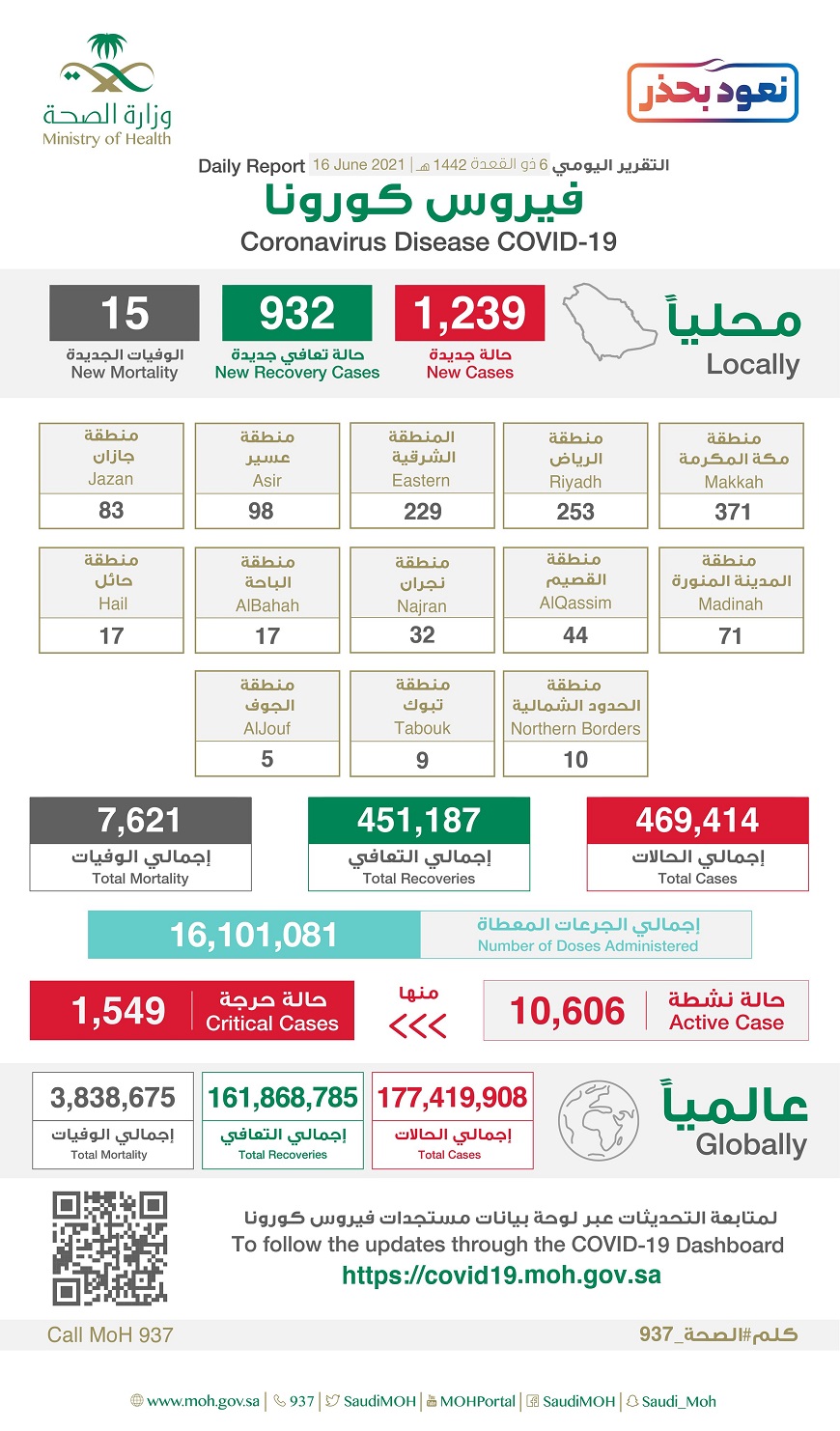 وفي نفس السياق، أعلنت «الوزارة»، الأربعاء «16 يونيو 2021»، إحصائية جديدة لمستجدات كورونا في المملكة خلال ال24 ساعة الماضية تضمنت تسجيل (1239) حالة مؤكدة وتعافي(932) حالة فيما بلغ عدد الحالات النشطة (10606) حالات منها (1549) حالة حرجة.