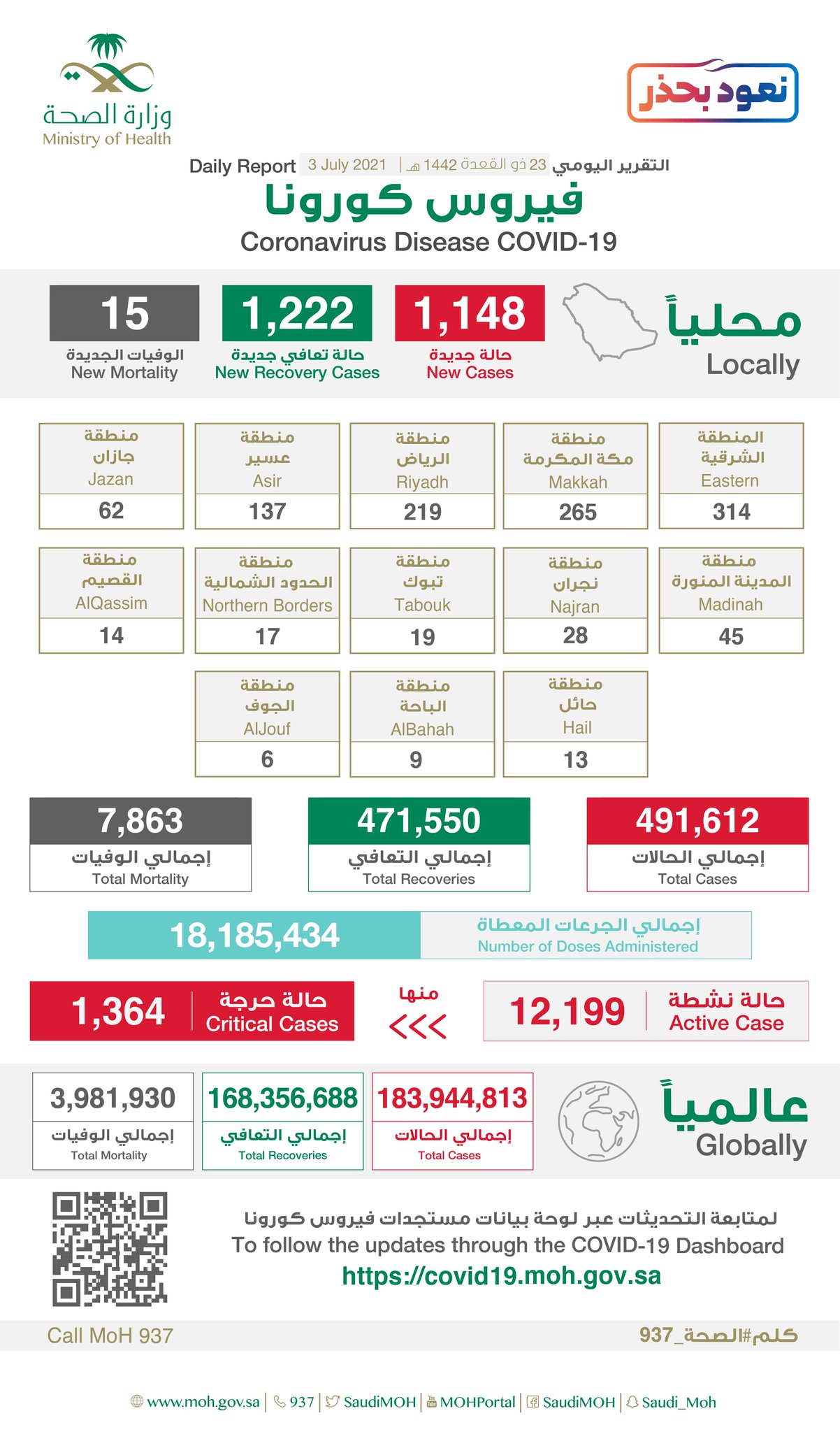 أعلنت الصحة، السبت (الثالث من يوليو 2021) إحصائية جديدة لمستجدات كورونا في المملكة خلال الـ24 ساعة الماضية تضمنت تسجيل (1148) حالة مؤكدة وتعافي (1222) حالة فيما بلغ عدد الحالات النشطة (12199) حالة منها (1364) حالة حرجة.