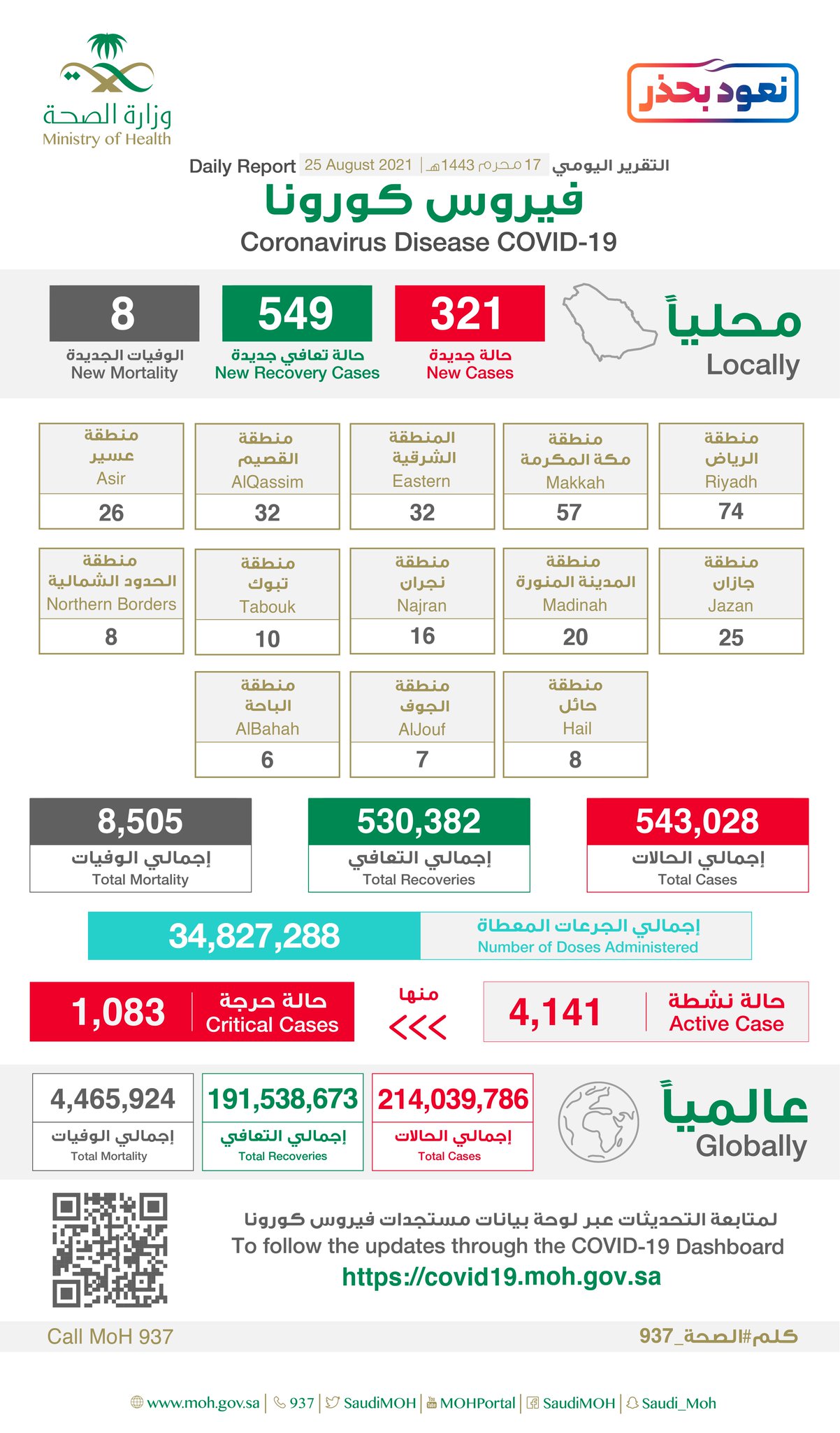 وفي نفس السياق، أعلنت الصحة إحصائية جديدة لمستجدات كورونا في المملكة خلال الـ24 ساعة الماضية تضمنت تسجيل (321) حالة مؤكدة وتعافي(549) حالة فيما بلغ عدد الحالات النشطة (4141) حالة منها (1083) حالة حرجة، وبينت الإحصائية أن إجمالي عدد الإصابات في المملكة بلغ(543028) حالة وبلغ عدد حالات التعافي (530382) حالة، وفيما يخص الوفيات فقد تم تسجيل عدد (8)حالات حيث وصل إجمالي عدد الوفيات في المملكة (8505) حالات “يرحمهم الله جميعاً”.