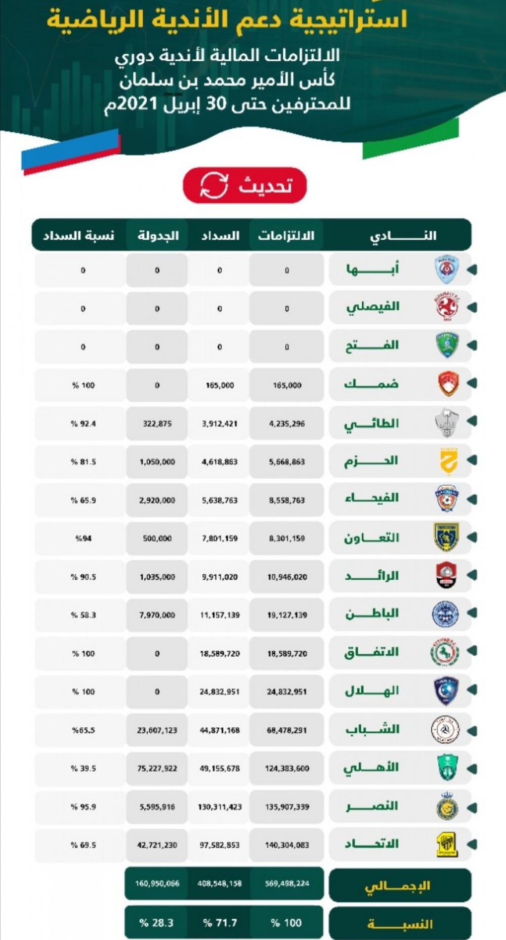 كشفت لجنة الكفاءة المالية للأندية الرياضية ما تم سداده من إجمالي الالتزامات المالية واجبة السداد حتى 30 إبريل 2021 ، مع منح شهادة الكفاءة المالية للأندية الرياضية التالية استناداً للمادة 11 من لائحة الكفاءة المالية للأندية الرياضية وهي: (أبها – الفتح – الفيصلي – ضمك – الهلال – الاتفاق – الطائي – الفيحاء – الرائد – التعاون – النصر – الأهلي – الشباب – الاتحاد – الباطن – والحزم)، مع الأخذ بعين الاعتبار القرار الصادر من اللجنة في يوم الأحد 22 أغسطس 2021م والقاضي بتعليق شهادة نادي الطائي اعتباراً من 19 أغسطس 2021م للأسباب الواردة في القرار.
