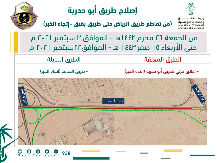 وكان فرع وزارة النقل والخدمات اللوجستية بالمنطقة الشرقية، قد أعلن البدء بإصلاح طريق أبوحدريه من تقاطع طريق الرياض إلى تقاطع طريق بقيق بإتجاه الخبر إبتداً من تاريخ ١٤٤٣/١/٢٦ هـ وحتى تاريخ ١٤٤٣/٢/١٥ هـ