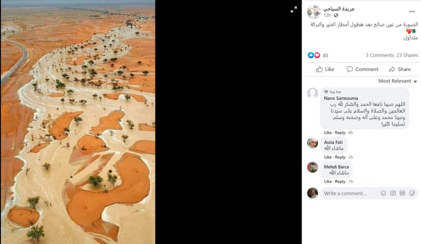 وظهر ادعاء خلال شهر آذار الماضي لصورة سيول ادّعى ناشروها أنها في ولاية عين صالح في الجزائر، بعد هطول أمطار غزيرة، وهو ما فنّده مسبار ووجده مضللًا.