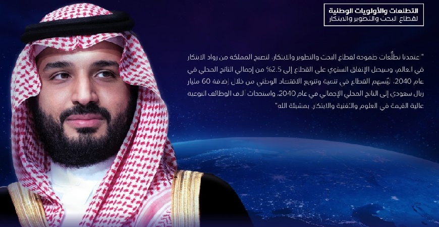 وقال سمو ولي العهد في مستهل الإعلان عن التطلُّعات والأولويات الوطنية: “اعتمدنا تطلُّعات طموحة لقطاع البحث والتطوير والابتكار، لتصبح المملكة من رواد الابتكار في العالم، وسيصل الإنفاق السنوي على القطاع إلى 2.5% من إجمالي الناتج المحلي في عام 2040، ليُسهم القطاع في تنمية وتنويع الاقتصاد الوطني من خلال إضافة 60 مليار ريال سعودي إلى الناتج المحلي الإجمالي في عام 2040، واستحداث آلاف الوظائف النوعية عالية القيمة في العلوم والتقنية والابتكار، بمشيئة الله”.