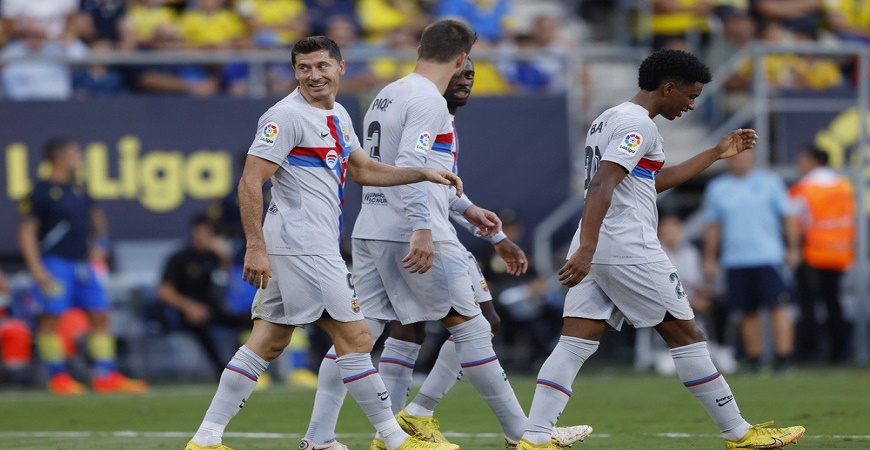 تصدر برشلونة ترتيب الدوري الإسباني لكرة القدم مؤقتا، بعد فوزه الكبير على مضيفه قادش 4 / صفر، سهرة السبت «العاشر من سبتمبر 2022»، ضمن منافسات المرحلة الخامسة من المسابقة.