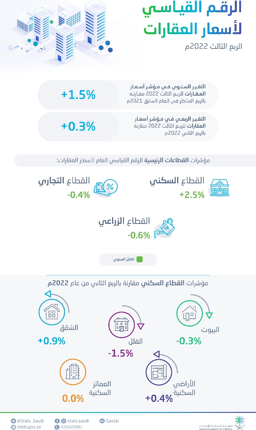 كشفت الهيئة العامة للإحصاء، الأربعاء «19 أكتوبر 2022»، نتائج الرقم القياسي لأسعار العقارات للربع الثالث من عام 2022م التي أفادت ارتفاع مؤشر الرقم القياسي العام لأسعار العقارات للربع الثالث 2022م بنسبة 1.5%، مقارنة بالربع نفسه من العام الماضي الربع الثالث 2021م، ويُعزى هذا الارتفاع إلى ارتفاع أسعار العقارات السكنية بنسبة 2.5+%.