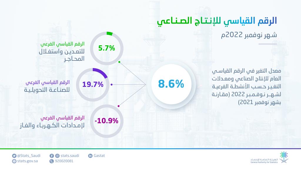 وأظهرت نتائج النشرة ارتفاع مؤشر الرقم القياسي للإنتاج الصناعي لشهر نوفمبر من عام 2022م بنسبة (8.6٪) مقارنةً بالشهر المماثل من العام السابق (نوفمبر 2021م) وجاء ذلك نتيجة للارتفاع في نشاط التعدين واستغلال المحاجر، ونشاط الصناعة التحويلية.