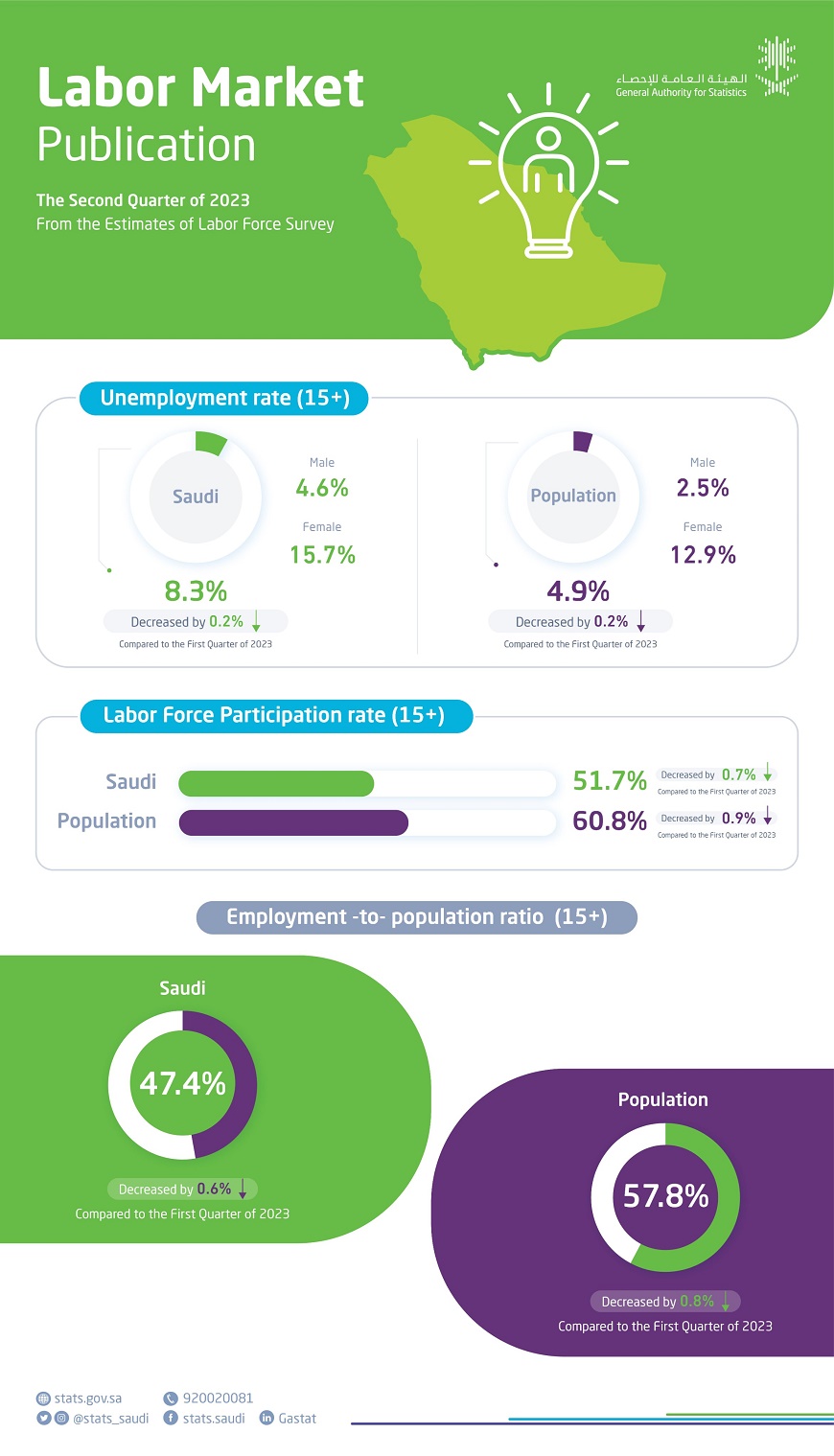 وأفادت نتائج نشرة سوق العمل للربع الثاني من عام 2023م انخفاض معدل المشاركة في القوى العاملة للسعوديات للربع الثاني من عام 2023م حيث بلغ (35.3%) مقارنةً بـالربع السابق، وانخفاض معدل المشاركة في القوى العاملة للسعوديين الذكور للربع الثاني من عام 2023م حيث بلغ (67.5%) مقارنةً بـ (68.3%) في الربع السابق.
