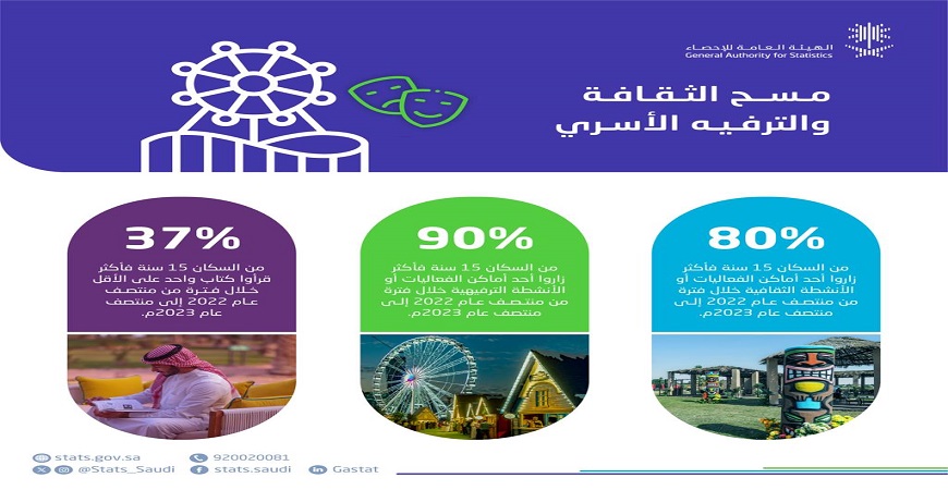 وتُعرض نتائج نشرة إحصاءات الثقافة والترفيه، بيانات عن زيارة وممارسة الأفراد «15 سنة فأكثر» للأنشطة والفعاليات الثقافية والترفيهية بناء على نتائج مسح الثقافة والترفيه الأسري من الهيئة العامة للإحصاء لعام 2023م، وذلك من خلال جمع البيانات باستخدام الاتصال الهاتفي، ورابط العد الذاتي لعينة من الأفراد المختارين، ولمزيد من التفاصيل حول النشرة يمكنكم زيارة الموقع الرسمي الهيئة العامة للإحصاء (stats.gov.sa).