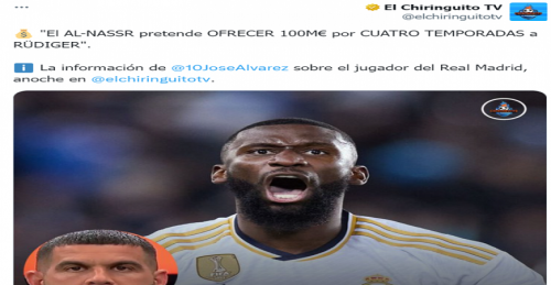 كشف برنامج «إل شيرينغيتو» الإسباني، أن نادي النصر يُجهز عرضًا ضخمًا هذا الصيف للتعاقد مع مدافع ريال مدريد، الألماني أنطونيو روديغير، لمدة 4 أعوام، مقابل راتب سنوي للاعب يصل إلى 25 مليون يورو.