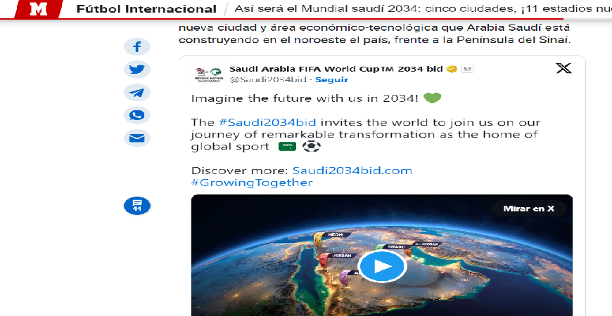 ركّزت صحيفة «ماركا» الإسبانية، على المؤتمر الصحفي، الذي أُقيم الأربعاء «31 يوليو 2024»، وشهد إزاحة الستار على ملف استضافة المملكة العربية السعودية لبطولة كأس العالم 2034، بعد تقديم ملف الترشح رسميًا في العاصمة الفرنسية باريس.