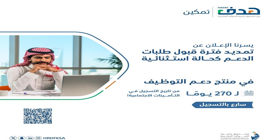 وأشار الصندوق إلى أن الاستثناء تضمن السماح للمنشآت برفع طلبات الدعم من اليوم 91 إلى اليوم 270 من تاريخ تسجيل الموظف لدى المؤسسة العامة للتأمينات الاجتماعية على نفس المنشأة، بدلا من اليوم 180 من تاريخ التسجيل، وذلك حتى تاريخ 17 ربيع الأول 1446هـ (الموافق 20 سبتمبر 2024م) ومن ثم تعود آلية منتج دعم التوظيف كما كانت سابقا.