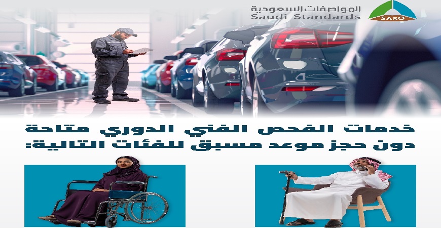 وقالت إنَّ الأشخاص ذوي الإعاقة، وكِبار السن ممَّن تجاوزوا الستين عامًا يمكنهم الحصول على خدمة الفحص الفني الدوري للمركبات المملوكة لهم مباشرة دون موعدٍ مسبقٍ في جميع مواقع الفحص الفني المنتشرة حول المملكة، تسهيلًا وتقديرًا لهم.