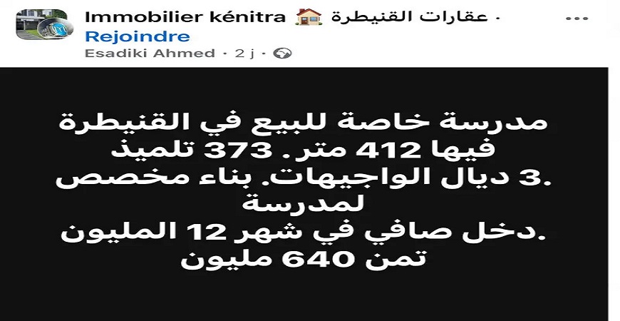 وجاء في الإعلان الذي نشر على إحدى الصفحات الخاصة بالعقارات بالقنيطرة، أن هناك مدرسة خاصة للبيع في القنيطرة تبلغ مساحتها 412 مترا. و373 تلميذا وتتوفر على 3 واجهات، مع دخل صافي في الشهر 12 مليونا.. ثمن 640 مليونا.