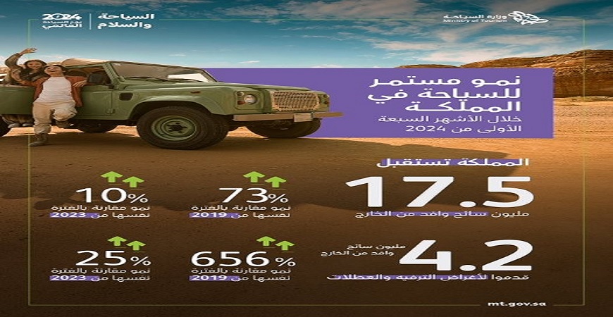 أعلنت وزارة السياحة، بالتزامن مع يوم السياحة العالمي، أن المملكة العربية السعودية استقبلت خلال الفترة من يناير وحتى نهاية شهر يوليو من العام الحالي 2024م، 17.5 مليون سائح وافد من الخارج، بزيادة تقدر بنسبة 10% مقارنةً بالفترة المماثلة من العام الماضي 2023م، وزيادة بنسبة 73% مقارنةً بالفترة المماثلة من العام 2019م.
