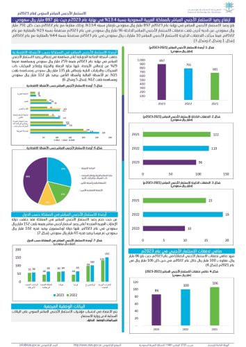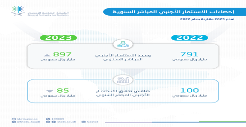 وكشفت نتائج النشرة، أن إجمالي التدفقات الداخلة للاستثمار الأجنبي المباشر في المملكة العربية السعودية (95,983) خمسة وتسعون مليارا وتسعمائة ثلاث وثمانون مليون ريال سعودي في عام 2023م ، بانخفاض نسبته 19 % في عام 2023م مقارنة بعام 2022 والتي بلغت 96 مليار ريال سعودي في عام 2023م