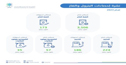 وأظهرت نتائج النشرة أن إجمالي إنتاج مادة البنزين في عام 2023 شهد انخفاضًا بنسبة 2.6% مقارنة بعام 2022 حيث بلغت كمية الإنتاج 224 مليون برميل. أما فيما يتعلق بمادة الكيروسين ووقود الطائرات فقد شهد ارتفاعًا في كمية الإنتاج حيث بلغت 57 مليون برميل مرتفعاً بنسبة 2.7% مقارنة بعام 2022.