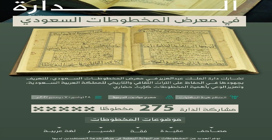 تشارك دارة الملك عبدالعزيز، في معرض المخطوطات السعودي، الذي تنظمه هيئة المكتبات، والذي بدأ بتاريخ «28 نوفمبر وينتهي في السابع من ديسمبر 2024م»، في مدينة الرياض، للمساهمة في التعريف بالتراث السعودي، وإبراز جهود المملكة في حفظ التراث المخطوط ورعايته، وصيانته، ورقمنته، وإتاحته.