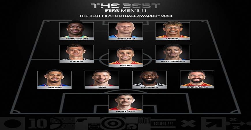 وفي خط الوسط : الإنجليزي جود بيلينجهام (ريال مدريد ) والإسباني رودري (مانشستر سيتي) والألماني توني كروس (ريال مدريد سابقا)… وفي الهجوم الإسباني لامين يامال (برشلونة ) والنرويجي إرلينج هالاند (مانشستر سيتي) والبرازيلي فينيسيوس جونيور (ريال مدريد).