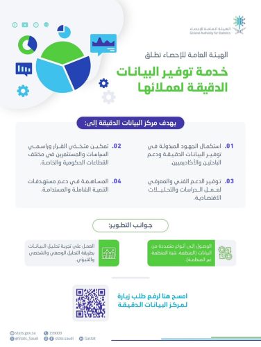 أطلقت الهيئة العامة للإحصاء (GASTAT) عبر مركز البيانات الدقيقةK خدمة توفير البيانات والمعلومات الإحصائية الدقيقة بهدف تمكين متخذي القرار وراسمي السياسات في القطاعات الحكومية والقطاع الخاص والأكاديميين والمهتمين بالشأن الإحصائي للتعامل مع البيانات لأغراض تحليل البيانات وبناء نماذج البيانات والتعرف على الفرص وتحديد التحديات المستقبلية في الأنشطة الاقتصادية والاجتماعية والمساهمة في دعم مستهدفات التنمية الشاملة والمستدامة.